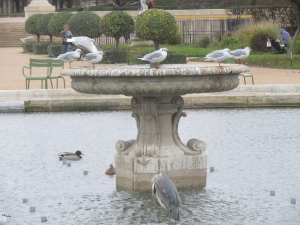 Mouettes rieuses, couple de canards colverts et héron cendré endormi, dans le bassin des parterres, au jardin des Tuileries, Paris centre.
