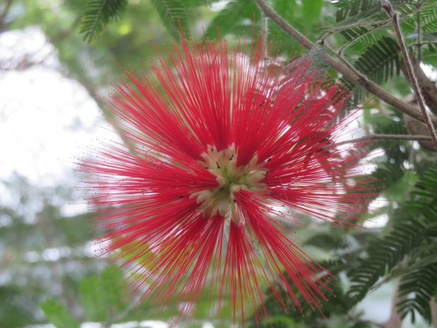 Inflorescence de Calliandra tweedii, dans la serre contemporaine dédiée à l’Amérique, au jardin d’Auteuil, 16e.