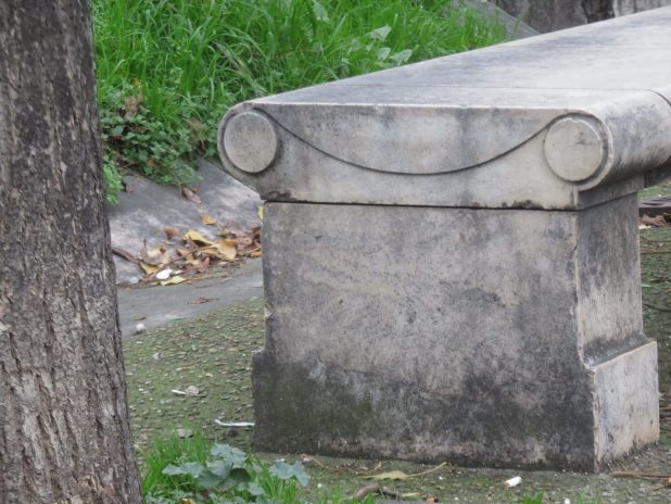 Banc souriant sur la place de la Bataille de Stalingrad, à la fin de la balade sur la Promenade urbaine, 18e/19e.