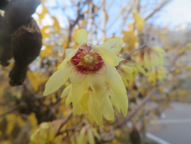 Fleur parfumée du Chimonanthus praecox, le bien nommé, au parc Martin Luther King, 17e.