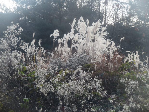 Contre jour matinal sur Miscanthus et anémones du Japon, au jardin Martin Luther King, 17e.
