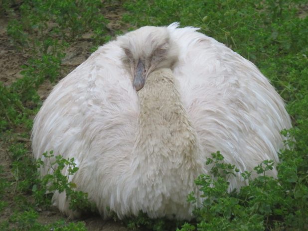 Nandou d’Amérique leucique, Rhea americana, en pleine sieste dans la ménagerie du jardin des plantes, 6e.
