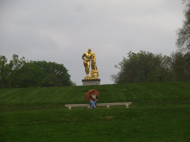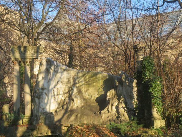 » Le rêve du Poète « , hommage à Alfred de Musset, 1810-1857, à admirer dans le jardin de la Nouvelle France, ex Vallée suisse, au pied du Grand palais, jardins des Champs Elysées, 8e.