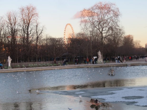 Canards sur la banquise dans l’octogone du jardin des Tuileries, Paris centre.