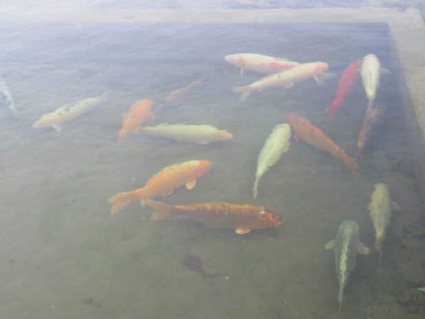 Carpes japonaises rassemblées dans la partie la plus profonde de l’octogone, au jardin des Tuileries, Paris centre.