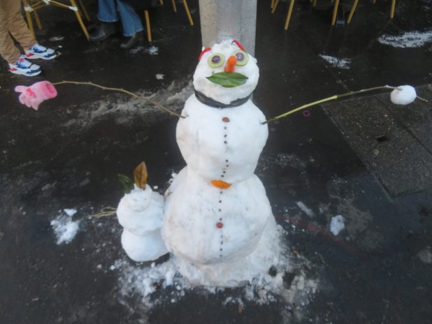 Bonhomme de neige et son lapin, non loin de l’église st Bernard, quartier de la Goutte d’Or, 18e.