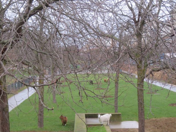 Chèvres en goguette sur l’ancien jardin de gravier transformé en pelouse, au jardin d’Eole, 18e.