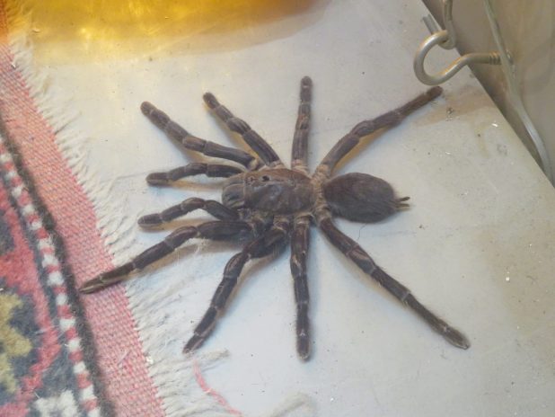Mygale en goguette dans la vitrine d’une boutique d’un passage couvert, Paris centre.