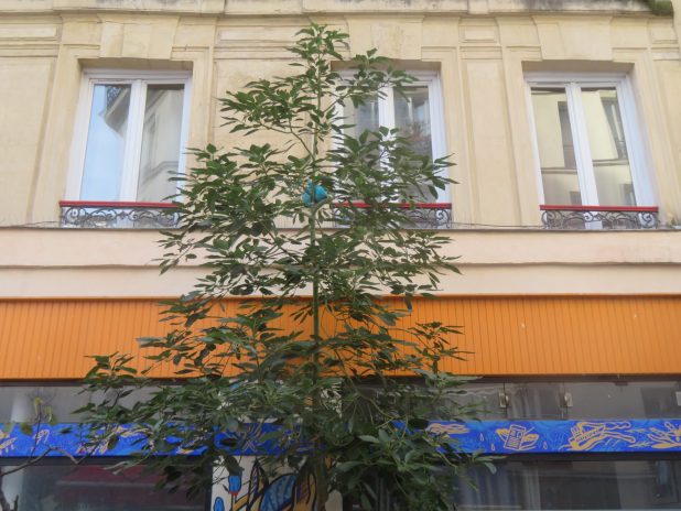 Vaillant avocatier, Persea americana, ayant résisté à la neige, au marché Dejean, quartier de la Goutte d’Or, 18e.