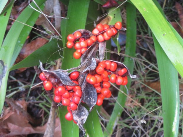 Infrutescence d’iris gigot, Iris foetidissima, au cimetière du Père Lachaise, 20e.