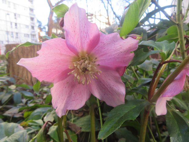 Rose de Carême, Helleborus orientalis, dans le jardin partagé Luquet, mitoyen du jardin de Belleville, 20e.