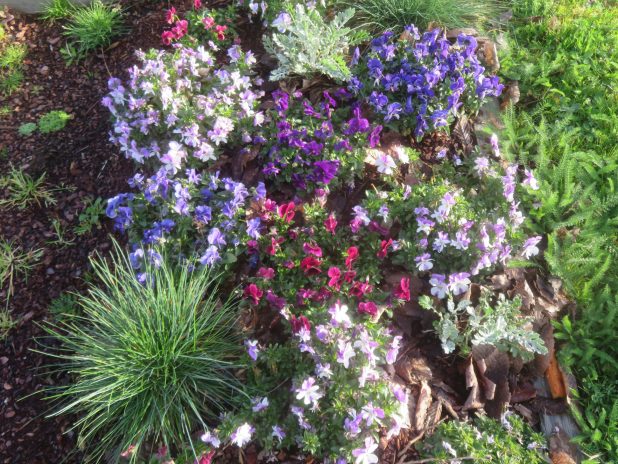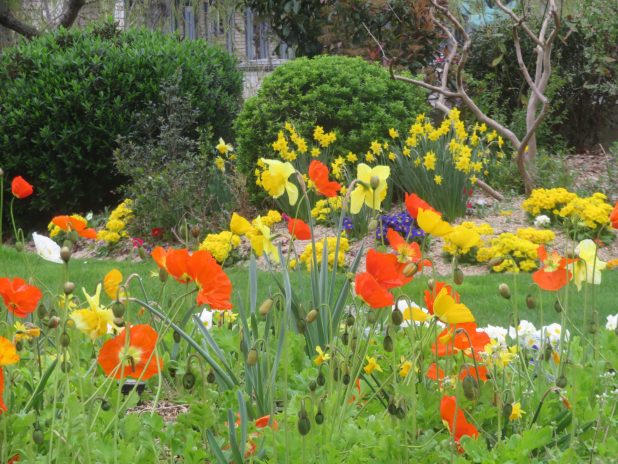 Corbeille colorée par pavots d’Islande, primevères et narcisses, près du pont de Bir Hakeim, à la fin de la balade en bords de Seine, 8e.