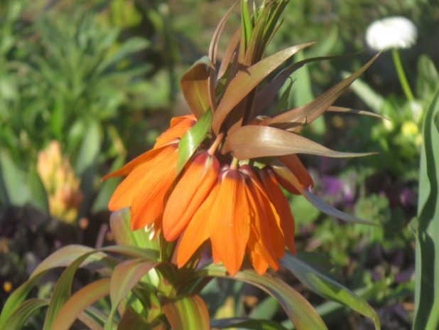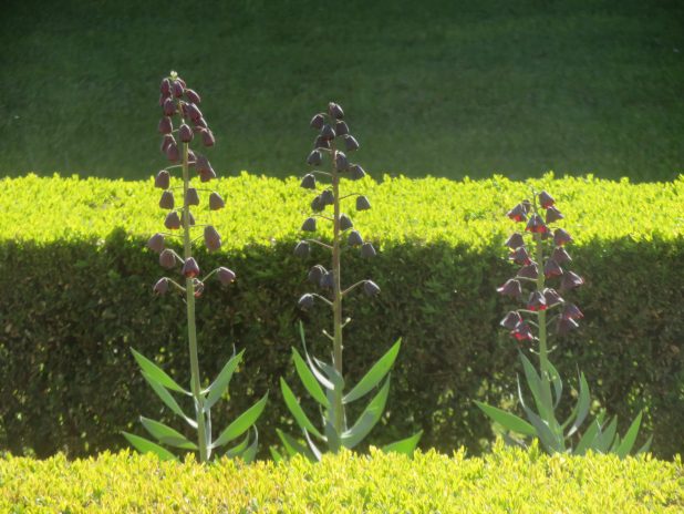 Floraison d’une fritillaire impériale ‘Sunset’, dans le grand parterre du jardin des Tuileries, Paris centre.