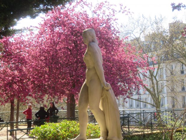 Amazone (1937), oeuvre de Georges Chauvel, 1886-1962, sur fond de pommiers en fleurs, au jardin de Reuilly, sur le parcours de la coulée verte René Dumont, 12e.
