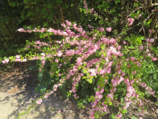 Fleurs de pêcher, Prunus persica, issu d’un noyau jeté par le public, près du jardin du dragon, au parc de la Villette, 19e.