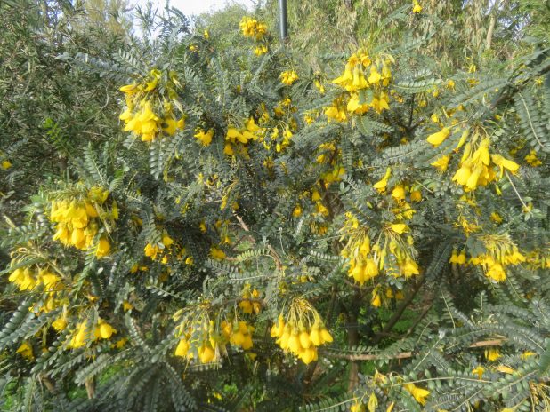 Jasmin primevère, Jasminum primulinum, en pied d’immeuble dans la rue Stephenson, quartier de la Goutte d’Or, 18e.