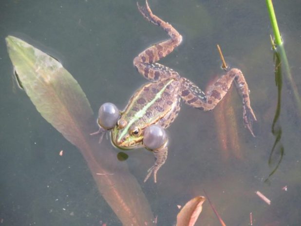 Grenouille rieuse coassant dans la mare de la tourbière, au jardin des plantes de Nantes, 44.