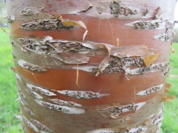 Tronc de cerisier de Mandchourie ‘Amber beauty’, à l’arboretum du Breuil, 12e.