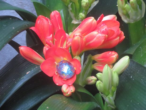 Joli oeuf largué par une cloche au coeur d’une fleur de Clivia miniata, dans la cour de mon immeuble, quartier de la Goutte d’Or, 18e.