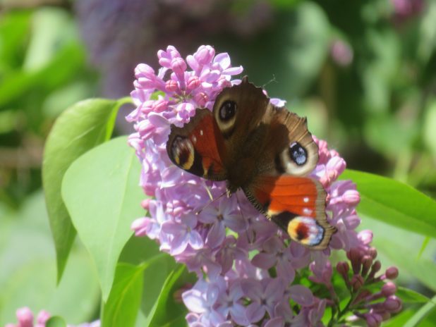 Paon du jour butinant un lilas au jardin partagé Ecobox, quartier de la Chapelle, 18e.