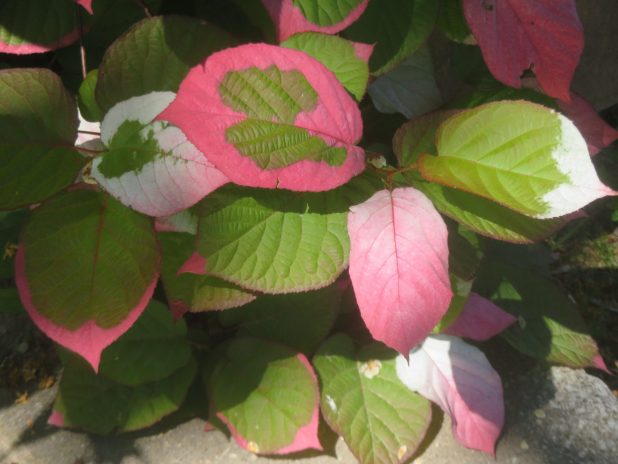 Jeunes feuilles d’Actinidia kolomikta, dans le jardin dédié à Malika-Eugénie Djendi, au parc André Citroën, 15e.
