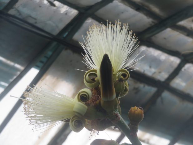 Sous le regard des fleurs de Pseudobombax elliptica, dans la serre des cactées, au jardin d’Auteuil, 16e.