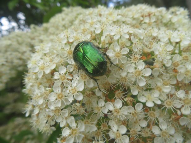 Cétoine dorée butinant un Photinia, au jardin des serres d’Auteuil, 16e.