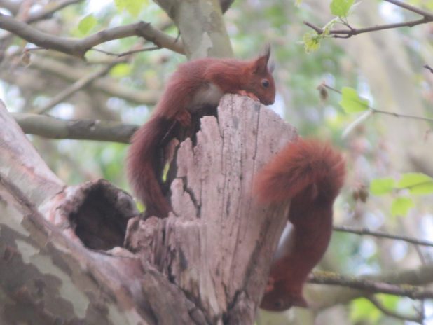 Jeunes écureuils, Sciurus vulgaris, découvrant le Monde au sortir de leur logis, au parc de Sceaux, 92.