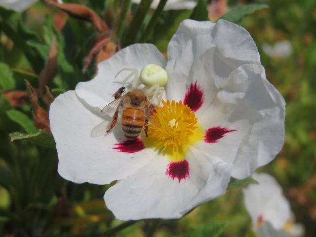 Fatal baiser de l’araignée thomise dans le jardin méditerranéen du parc de l’Île st Germain, 92.