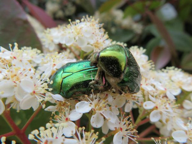 Amours des cétoines dorées dans le jardin des métamorphoses du parc André Citroën, 15e.