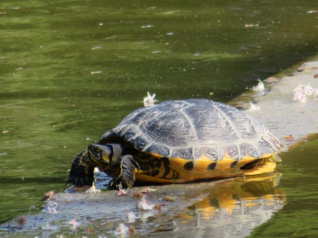 Bain de soleil d’une tortue de Floride, au parc des Buttes Chaumont, 20e.