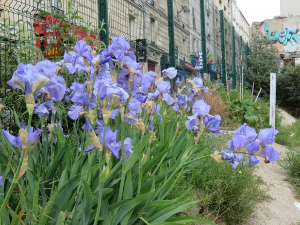 Somptueuse touffe d’Iris dans le jardin de l’association » la Table ouverte « , quartier de la Goutte d’Or, 18e.