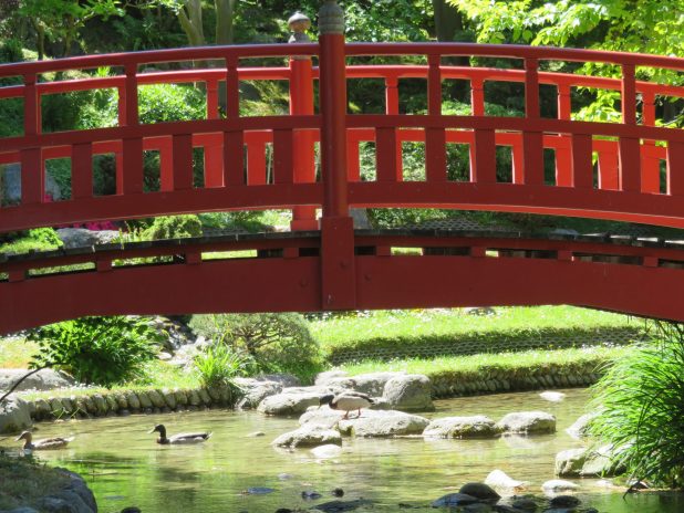 Canards colverts déambulant sous le » pont de Nikko « , au jardin Albert Kahn, 92.