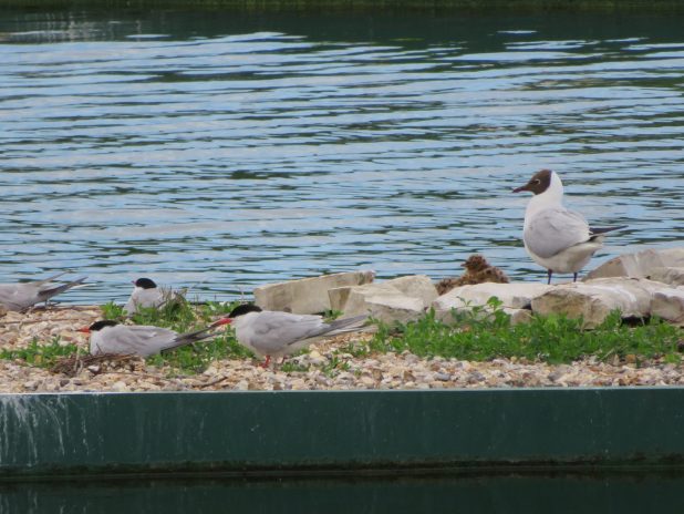 Mouette rieuse et sternes pierregarins nichant sur un radeau, au parc des Chanteraines, 92.