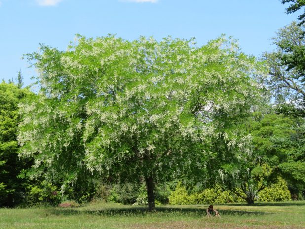 Promenade vespérale sous les Sophora du Japon, près de la station de métro Ménilmontant, 20e.