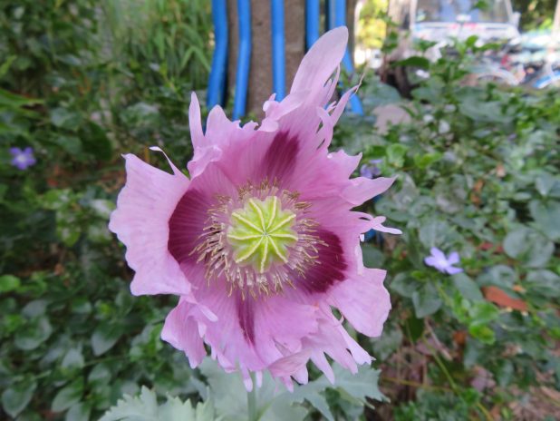 Fleur de pavot somnifère au pied d’un Magnolia grandiflora, près de l’église st Bernard, quartier de la Goutte d’Or, 18e.