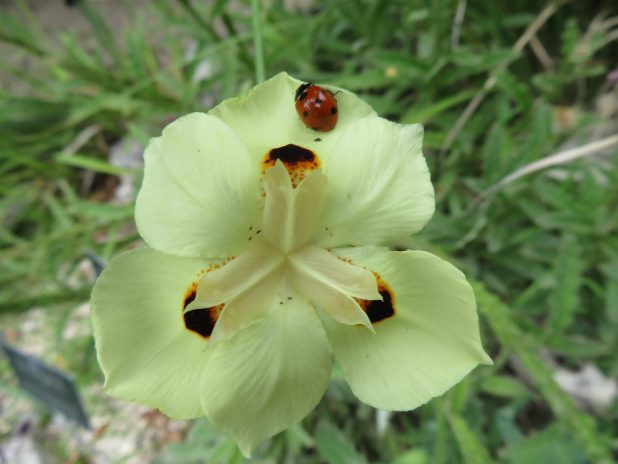Fleur de Dietes bicolor visitée par une coccinelle, dans le jardin alpin du jardin des plantes, 5e.