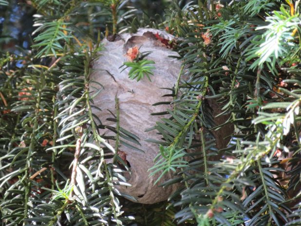 Nid de guêpes dissimulé dans un if, au jardin du Pré Catelan, 16e.