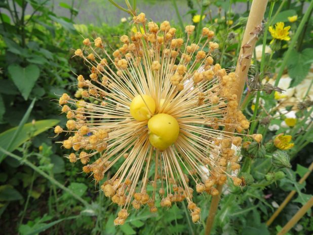 Tête d’ail décoratif formant ses fruits dans le jardin des Tuileries, Paris centre.