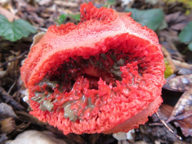 Bouche d’un clathre rouge à l’haleine cadavérique, au parc André Citroën, 15e.