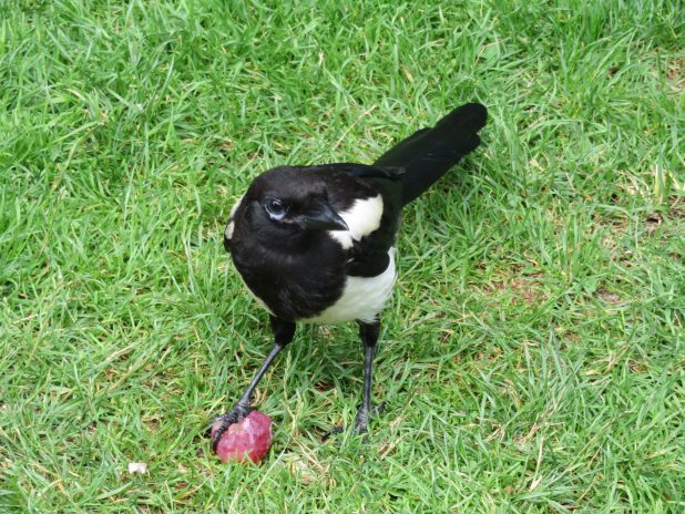 Jolie pie se délectant d’un raisin, sur une pelouse du parc Montsouris, 14e.