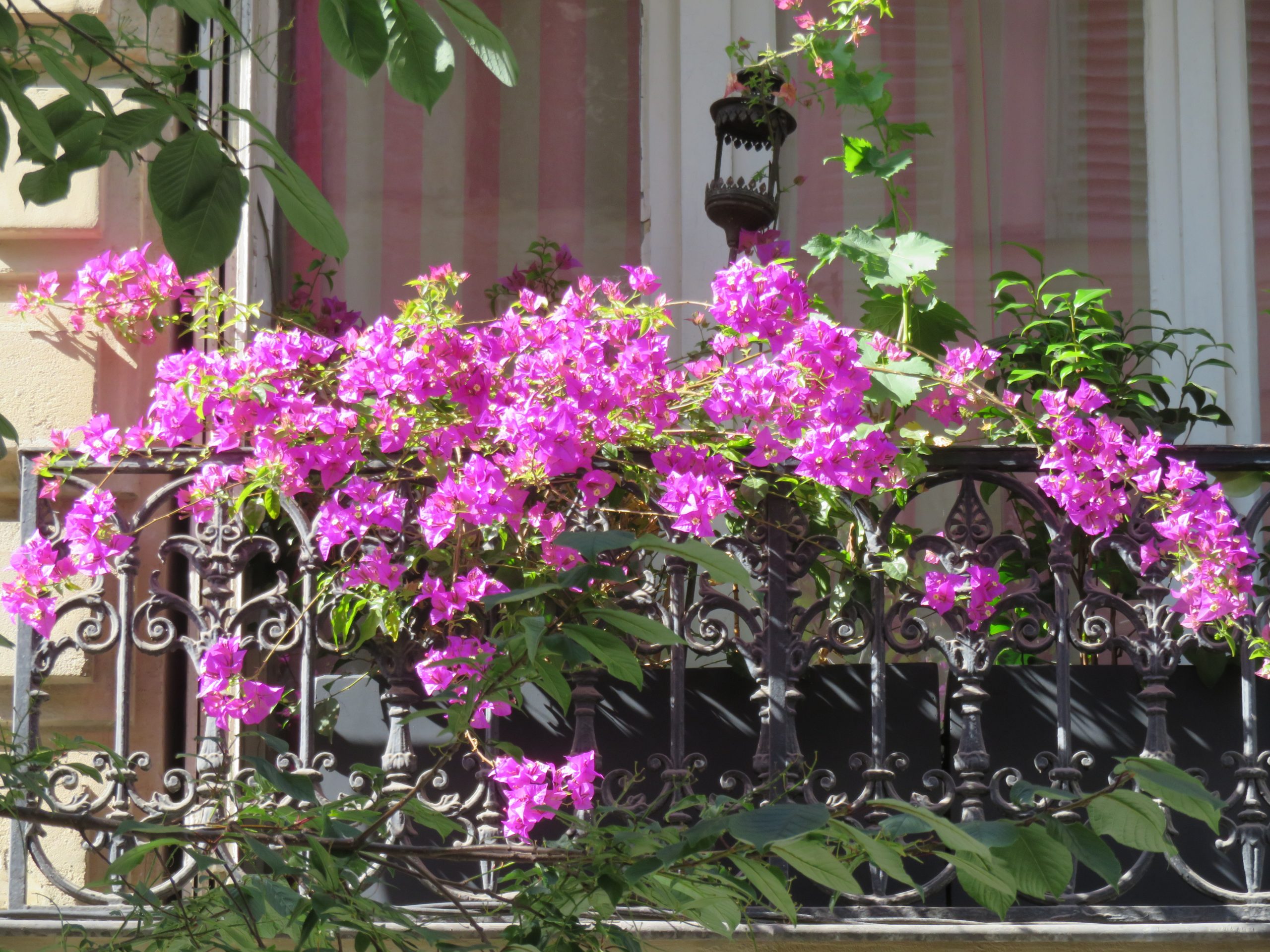 Bougainvillée en bord de fenêtre dans la rue Rambuteau, quartier du Marais, Paris centre.