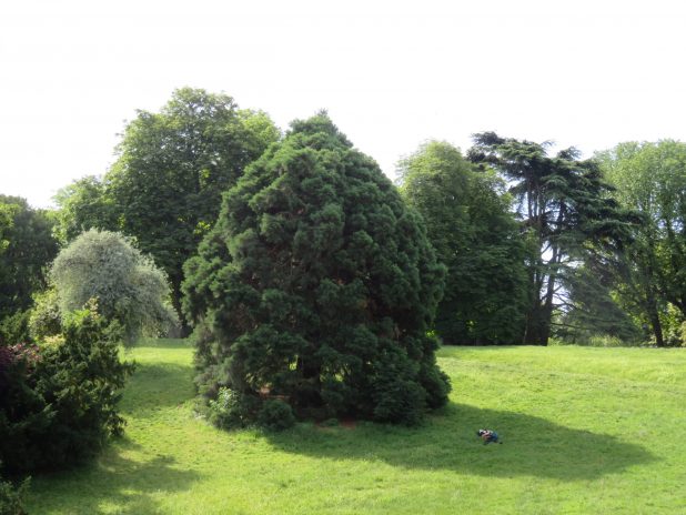 Jour tranquille au pied du Sequoiadendron au parc des buttes Chaumont, 19e.