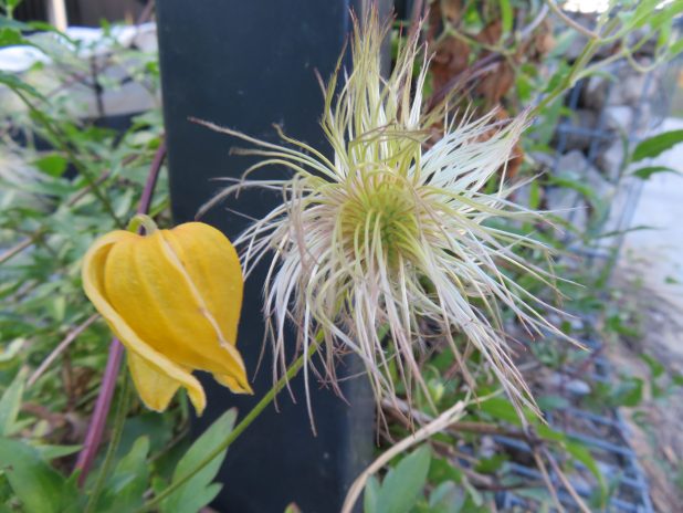 Fleur et fruit de Clematis tangutica sur la petite ceinture du 16e.