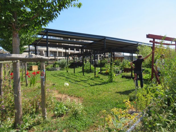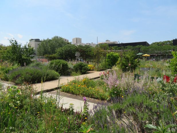 Jardin sur le toit du gymnase de la rue des Haies, quartier de Charonne, 20e.