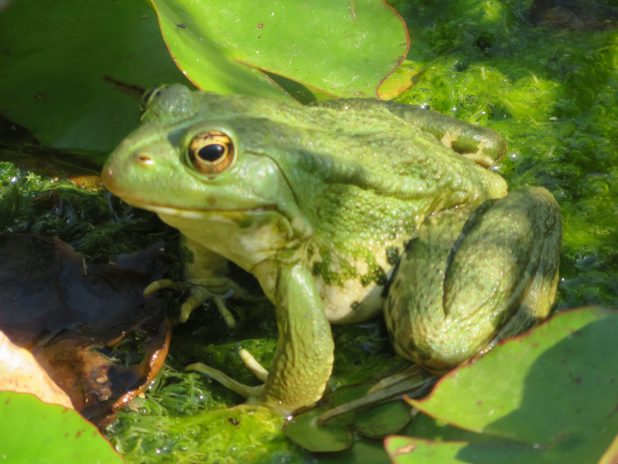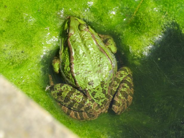 Bain de siège d’une grenouille dans la mare du jardin naturel, quartier de Charonne, 20e.