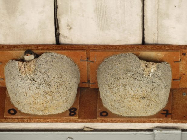 Jeune hirondelle de fenêtre, en attente de ravitaillement sur la grande halle du parc de la Villette, 19e.