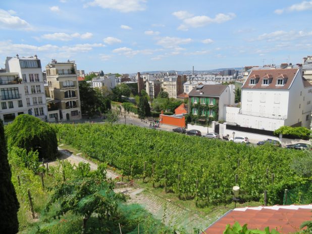 Vigne, cimetière, et cabaret du Lapin agile depuis le jardin du musée de Montmartre, 18e.