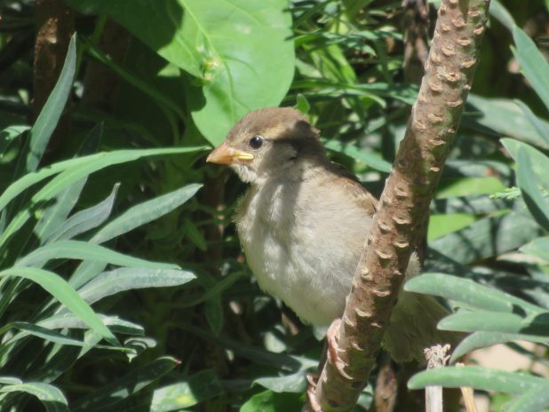 Jeune moineau domestique découvrant le jardin du Champ de Mars, 7e.