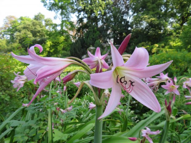Floraison d’un Crinum X powellii, près du lac de Varé au parc de Bagatelle, 16e.